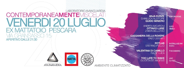 Lo Spazio Matta a Pescara, esclusivo fulcro dell’arte e della cultura in città, si apre ad una nuova invasione del Laboratorio Avanguardia: arte, musica, cibo tutto “mescolato” in Contemporaneamentemiscelati, un appuntamento esclusivo fissato per la sera di venerdì 20 luglio.