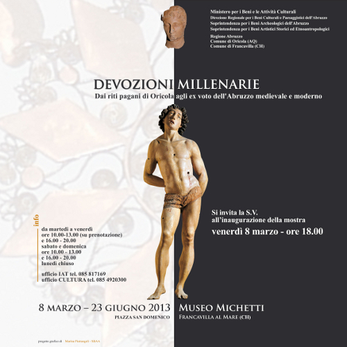 Sarà inaugurata oggi, 8 marzo, presso il MUMI di Francavilla al Mare la mostra “Devozioni millenarie-Dai riti pagani di Oricola agli ex voto dell’Abruzzo medievale e moderno” a cura della Soprintedenza per i beni archeologici dell’Abruzzo, della Soprintendenza BSAE dell’Abruzzo in collaborazione con la Regione Abruzzo, i Comuni di Oricola (AQ) e Francavilla al Mare.