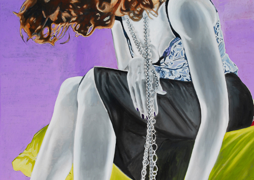 Nella Sala E. Flaiano viene presentato il nuovo lavoro di Di Carlo, “Oh my dog!”, storia di amore raccontata in nove atti, nove tele di grandi dimensioni, diario intimo e privato di vissuto (stra)ordinario, immagini oscillanti tra tensione ed attesa, desiderio e turbamento, dolci e crudeli allo stesso tempo; vista e sensi stuzzicati e tormentati, gioco di una seduzione esplicita, dichiarata, o che si rivela inconsapevolmente, nella spontaneità di veloci gesti quotidiani. Come spesso accade nei dipinti di Di Carlo, la narrazione avviene per particolari, dettagli “fotografici”, quei piccoli elementi esemplari ed evocativi che arginano fuori dal quadro qualsiasi ripetizione o distrazione visiva. Il taglio è dal basso in alto, il punto di vista vuole essere quello di un cagnolino: oh my dog!, gioco di parole tra sbalordimento ed eccitazione, metafora di ruoli e del rapporto uomo/donna, volontaria (volontaria?) sottomissione, ai piedi dell’oggetto del desiderio, a terra, quasi strisciante. Immagini in bianco e nero, come lastre in negativo, si alternano a colori freddi e squillanti, vividi ed intensi, accattivanti, dominati dai toni verdi acido, i viola ed i blu.