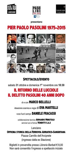 Sabato 31 e domenica 1 novembre le Associazioni “Il piccolo resto” e “L’Altritalia” intendono rendere omaggio a Pasolini con lo Spettacolo – evento “Il ritorno delle lucciole: il delitto Pasolini quarant’anni dopo”, inserito nelle commemorazioni ufficiali patrocinate dal Ministero dei Beni delle Attività Culturali e del Turismo.