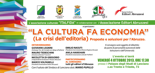 È fissato per oggi nel Palazzo degli Studi di Lanciano il convegno LA CULTURA FA ECONOMIA – La crisi dell’editoria. Proposte e soluzioni per l’Abruzzo organizzato dall‘Associazione culturale Italfida in collaborazione con l’Associazione Editori Abruzzesi.