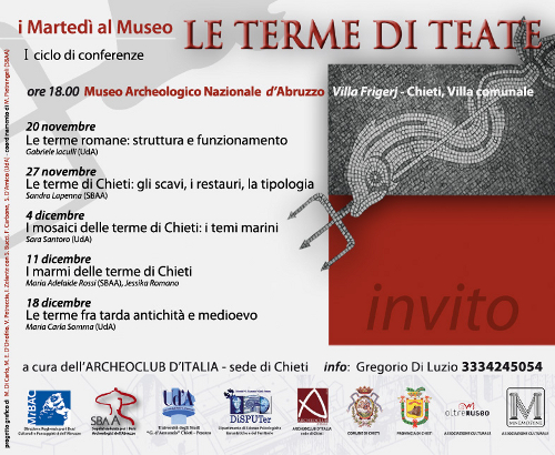 Inizia il 20 novembre a Chieti presso il Museo Archeologico Nazionale Villa Frigerj il primo ciclo di conferenze “i martedì al museo” a cura dell’Archeoclub d’Italia, sede di Chieti, in collaborazione con i funzionari della Soprintendenza per i beni archeologici dell’Abruzzo. Esso è parte integrante del progetto didattico interistituzionale “Le terme di Teate e la decorazione a mosaico” che a sua volta prende le mosse dal “Laboratorio di documentazione,diagnostica e restauro dei mosaici delle terme di Teate” riservato agli studenti dalla Cattedra di Archeologia Classica del DISPUter- CAAM dell’Università Chieti-Pescara – diretta dalla prof.ssa Sara Santoro – ed attuato con la supervisione scientifica della Soprintendenza stessa.