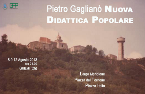 Il programma di residenza GuilmiArtProject, che dal 2007 destabilizza le pratiche progettuali dell’arte operando in un territorio di provincia al di fuori del sistema consolidato, si arricchisce quest’anno della presenza del critico e curatore Pietro Gaglianò, che si occupa da tempo di temi caldi dell’arte contemporanea, quali questioni partecipative e di responsabilità dell’artista. Molto versato alla didattica, che esplica sia tradizionalmente, in lezioni universitarie, che con formati più leggeri quali tavole rotonde, presentazioni, conferenze, Gaglianò è stato invitato per la sua capacità comunicativa con la quale intratterrà il paese abruzzese, in programma come Nuova Didattica Popolare. Il pubblico sarà chiamato a reagire agli stimoli di ciò che l’ospite, bandite le lezioni frontali, metterà in campo e, armato di nuove intuizioni, immagini e storie, sarà messo in grado di aprirsi un varco nel fortino inespugnabile della conoscenza dell’arte solitamente occupato dagli addetti ai lavori. Con le lezioni di Nuova Didattica Popolare, Pietro Gaglianò sarà la miccia e il vettore di una serie di riflessioni collettive sull’arte e sull’esperienza.