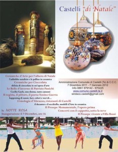 Dal 7 dicembre 2011 al 7 gennaio 2012, Castelli, splendido borgo e culla dell’arte della ceramica, ospita “Castelli di Natale”, la kermesse natalizia di storia, arte, cultura e gastronomia. Per l’occasione, gli abeti e i pini dei boschi vengono addobbati con palline artigianali in ceramica e, per tutto il periodo delle Feste, si moltiplicano gli appuntamenti e gli eventi a tema.