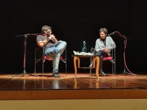 In platea si respira un’aria diversa dai soliti eventi, aria di famiglia, di accoglienza, d’intimità. Molti, tra il pubblico, sono amici di vecchia data dell’autrice ma ciò che fa davvero la differenza è chi l’affianca sul palco: Michele Picioccio. Michele e Donatella (perdonatemi la licenza) si conoscono da anni tant’è che di tanto in tanto i ruoli si invertono ed è l’autrice a presentarci chi la sta presentando: Michele Picioccio poeta e medievalista. Infatti quest’ aria di famiglia si respira soprattutto nel dialogo tra i due attori, che catturano l’attenzione e l’interesse del pubblico come pochi sanno fare. Non le solite domande, belle ed intime le risposte. È la stessa Di Pietrantonio a far notare la cosa. Anche perché, ci svela, che a differenza di quella che di solito è la prassi, le domande non sono state concordate.