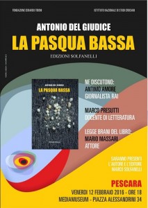 Torna in libreria “La Pasqua bassa”, il romanzo di Antonio Del Giudice, ristampato dall’editore Solfanelli. Se ne parlerà venerdì 12 febbraio al Mediamuseum di Pescara. Ne discutono Marco Presutti, vice Presidente della Fondazione Edoardo Tiboni per la cultura; Antimo Amore, giornalista Rai; leggerà brani del libro Mario Massari, attore. Saranno presenti l’editore e l’autore che risponderà alle domande del pubblico.