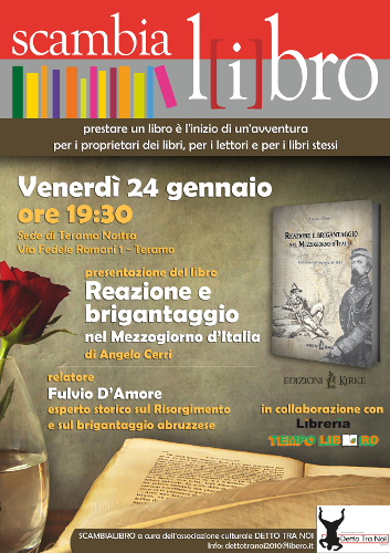Il libro che verrà presentato è la riedizione di “Reazione e Brigantaggio nel Mezzogiorno d’Italia”: volume del 1893 sul brigantaggio e la sua genesi scritto da Angelo Cerri e curato per la mristampa da Fulvio D’Amore, ospite gradito assieme all’editore.