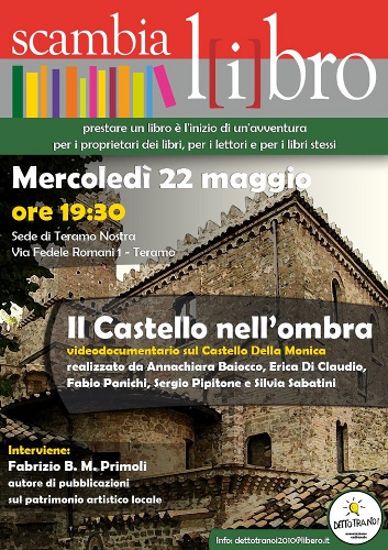 L’appuntamento mensile con il libro e la lettura, ormai un classico dell’offerta culturale teramana, in occasione dell’appuntamento di Maggio “adotta” il castello della Monica. Mercoledì 22 maggio presso la sede di Teramo Nostra, verrà proiettato il documentario realizzato da Fabio Panichi, un lavoro curato e realizzato da Annachiara Baiocco, Erica Di Claudio, Fabio Panichi, Sergio Pipitone e Silvia Sabatini, studenti della Facoltà di Scienze della Comunicazione dell’Università di Teramo.
