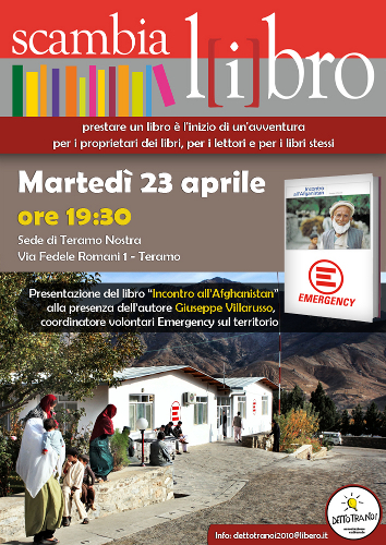 In collaborazione con il gruppo volontari Emergency di Teramo, martedì 23 aprile torna lo Scambialibro. Protagonista di questo mese sarà Giuseppe Villarusso, storico volontario e coordinatore nazionale dei gruppi territoriali di Emergency, con il suo libro “Incontro all’Afghanistan”. Il libro racconta per immagini l’attività di tre ospedali dell’Associazione attivi dal 1999: ad Anabah nella valle del Panshir, a Kabul e a Laskar-gah. È un viaggio attraverso un Paese denso di storia, arte e cultura, dilaniato da “ripetuti e non voluti periodi di guerra, mentre avrebbe potuto vivere la sua storia senza interferenze, senza imposizioni e condizionamenti”. Una terra in cui l’autore entra in punta di piedi, “ospite in un luogo che descrivono inospitale” per “guardare ma non toccare, parlare ma non gridare, proporsi ma non imporsi”.