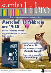 Mercoledì 18 febbraio presso la sede di “Teramo Nostra” si terrà la presentazione del libro “Lo dico al TG” (Ed. Ricerche&Redazioni) del giornalista di Rai 3 Umberto Braccili, un titolo che prende spunto dalla trasmissione che da qualche anno raccoglie i disagi e gli sprechi che si consumano in Abruzzo.