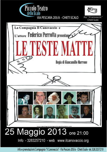 Sabato 25 Maggio presso il Piccolo Teatro dello Scalo, da un’idea di Giancamillo Marrone e Federico Perrotta, verrà allestito in prima assoluta lo spettacolo LE TESTE MATTE di e con Giancamillo Marrone, con la straordinaria partecipazione di Federico Perrotta e con Antonella Giancaterino, Carmen Giancaterino, Stefano Di Salvatore, Alessandro Peca, Paola D’Onofrio, Antonella Angelozzi, Anna di Prato, Rosario Cicellini, Vincenzo Battista, Antonio Bottino. Luci, e suono: Fabio Consorte.