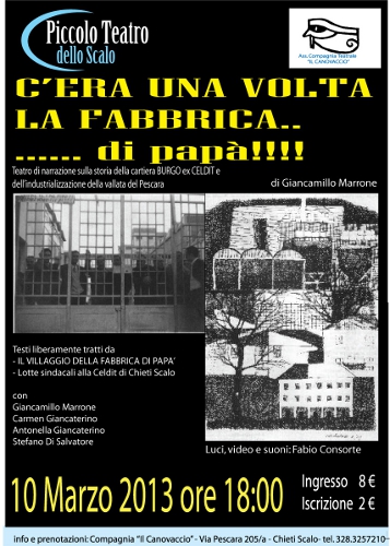 Domenica 10 Marzo presso il Piccolo Teatro dello Scalo verrà replicato, dopo l’ottimo successo a Pratola Peligna, lo spettacolo “C’era una volta la fabbrica di…papà”, di e con Giancamillo Marrone e con Antonella Giancaterino, Carmen Giancaterino, Stefano Di Salvatore. Luci, video e suono di Fabio Consorte.