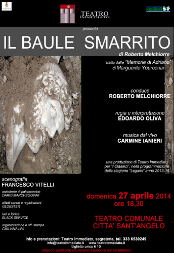 La compagnia teatrale pescarese porterà in scena uno degli spettacoli di maggior successo del suo cartellone: Il baule smarrito di Roberto Melchiorre, tratto dalle Memorie di Adriano di Marguerite Yourcenar. Il testo della scrittrice francese, uno dei più affascinanti del Novecento, pubblicato nel 1951 e scritto, come ha affermato la stessa Yourcenar, “con un piede nell’erudizione e l’altro nella magia”, rappresenta uno degli esempi più originali di romanzo storico.
