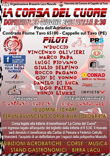 I piloti Vito Antonio Liuzzi e Federico D’Annunzio, i comici ‘Nduccio, Marco Papa e Vincenzo Olivieri, il ciclista Danilo Di Luca, l’indimenticata bandiera del Pescara Calcio Rocco Pagano, il cantante Giò Di Tonno, Luigi Piovano, Primo violoncello dell’Accademia Nazionale di Santa Cecilia, Giulio Delfino, voce di “Tutto il calcio minuto per minuto”, e Gianfranco Mazzoni, storica voce Rai della Formula 1, hanno raccolto l’invito di Ugo Faieta, patron del birrificio artigianale Lacu di Moscufo, per dare vita a una gara di go-kart in cui a vincere sarà la solidarietà.