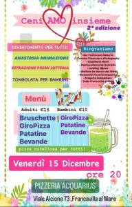 Venerdì 15 dicembre, alla pizzeria Acquarius di Francavilla al Mare, si terrà una cena di beneficenza in favore dell’AGBE (associazione genitori bambini emopatici di Pescara).