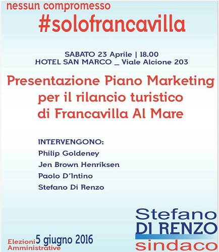 Sabato 23 aprile, il Candidato Sindaco Stefano Di Renzo e la coalizione che lo sostiene, presenteranno il Piano Marketing per il rilancio turistico di Francavilla Al Mare.