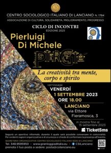 La serie di eventi sarà inaugurata venerdì 1° settembre, alle 18.00, nella sede dell’Associazione in via Fieramosca, con il vernissage della mostra “L’arte: la creatività tra corpo, mente e spirito” dell’architetto e artista Pierluigi Di Michele, in arte PierGiò.