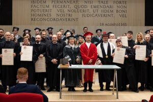 «Questa è una cerimonia importante per una serie di motivi – ha detto il Preside della Facoltà di Scienze della Comunicazione, il Professor Christian Corsi -. Innanzitutto perché è il compimento di un percorso triennale, ma fare parte del dipartimento di Scienze della Comunicazione significa farne parte al di là del ruolo istituzionale di studente e, con i miei colleghi, rinnoviamo la disponibilità per il proseguimento della vostra formazione, ma anche per una condivisione orientata alla vostra crescita. È un momento importante per voi, dicevo, e per le vostre famiglie, ma è anche un momento importante per noi, perché in qualche modo oggi si sottolinea il valore del nostro lavoro nell’accompagnarvi in un percorso di crescita. Inoltre tra di voi ci sono anche laureandi della coorte ATSC, quindi professionisti e, quando un professionista decide di affidarci il proprio percorso di crescita professionale e formativa per noi è una scelta molto fondamentale».