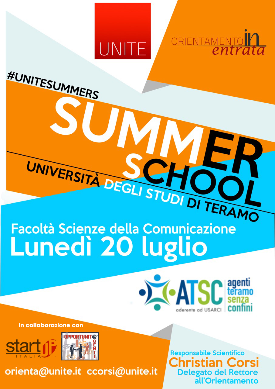 La Summer School si svolgerà nella Facoltà di Scienze della Comunicazione a Teramo: dalle 9.30 alle 17.30, i docenti del Corso presenteranno alcune tra le principali materie di studio. Al mattino, il Professor Christian Corsi terrà un seminario sulla “Comunicazione d’Impresa” e il Professor StefanoTraini tratterà i fondamenti di “Semiotica”. Dopo la pausa pranzo sarà il turno del Professor RaffaeleMascella con una interessante lezione di “Logica” e del Professor MarcoGaldenzi che introdurrà “Tecniche di Vendita”, insegnamento proposto in esclusiva, in Italia, dall’Ateneo teramano.