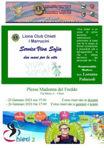 «Un altro importante service realizzato dal Lions Club Chieti I Marrucini: nei giorni 23 e 26 gennaio abbiamo avuto e avremo il piacere di presentare “VIVA SOFIA”, un corso di primo soccorso e rianimazione polmonare di base, che ha lo scopo di fornire conoscenze e procedure utili a salvaguardare la vita in attesa del personale del 118 – ha spiegato la Presidente del Lions Club Chieti “I Marrucini”, Emanuela Marchione -. Il corso, rivolto a docenti, genitori e nonni, è tenuto dal responsabile medico Lions Dott. Lorenzo Palazzoli e si svolge nei locali del Plesso Madonna del Freddo dell’Istituto Comprensivo 2, in Via Muzii n. 6, grazie alla disponibilità del Dirigente Scolastico Giovanna Santini, particolarmente sensibile nei confronti di questa importante tematica. Vi aspettiamo!».