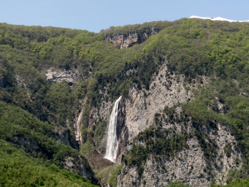 Dal laghetto si prende la carrareccia segnata con simbologia C.A.I. che attraversa un paesaggio pedemontano costituito da boschi termofili. Dopo circa trenta minuti di piacevole cammino si arriva alla fine della carrareccia (quota 760 m.s.l.m.) e, girando a sinistra, s’imbocca il sentiero che attraversa località “Le scalelle”. L’ambiente è rupestre e si costeggia a destra una parete di roccia su cui sono aggrappati carpini neri e lecci con le tipiche forme contorte. Si arriva ad una piccola statua raffigurante una Madonna (q. 850 m.s.l.m.), da dove si può godere un bellissimo panorama. Superata la statuetta si piega a sinistra verso il fosso, attraversandolo. L’ambiente cambia completamente e ci si ritrova all’interno di un bosco di carpino nero e, sebbene la tendenza non sia diminuita, l’ombra delle chiome ci permette di procedere con più sollievo. Il sentiero costeggia il fosso per un po’, per poi distaccarsene e diminuire la pendenza. Si giunge così ad uno sgrottamento costituito da un’ampia volta da cui si sono staccati grossi frammenti di roccia. Siamo in corrispondenza della sottostante cascata di Zompo lo Schioppo. Dopo una breve salita si arriva alla Chiesa di S. Maria del Pertuso (q. 1100 m.s.l.m.)